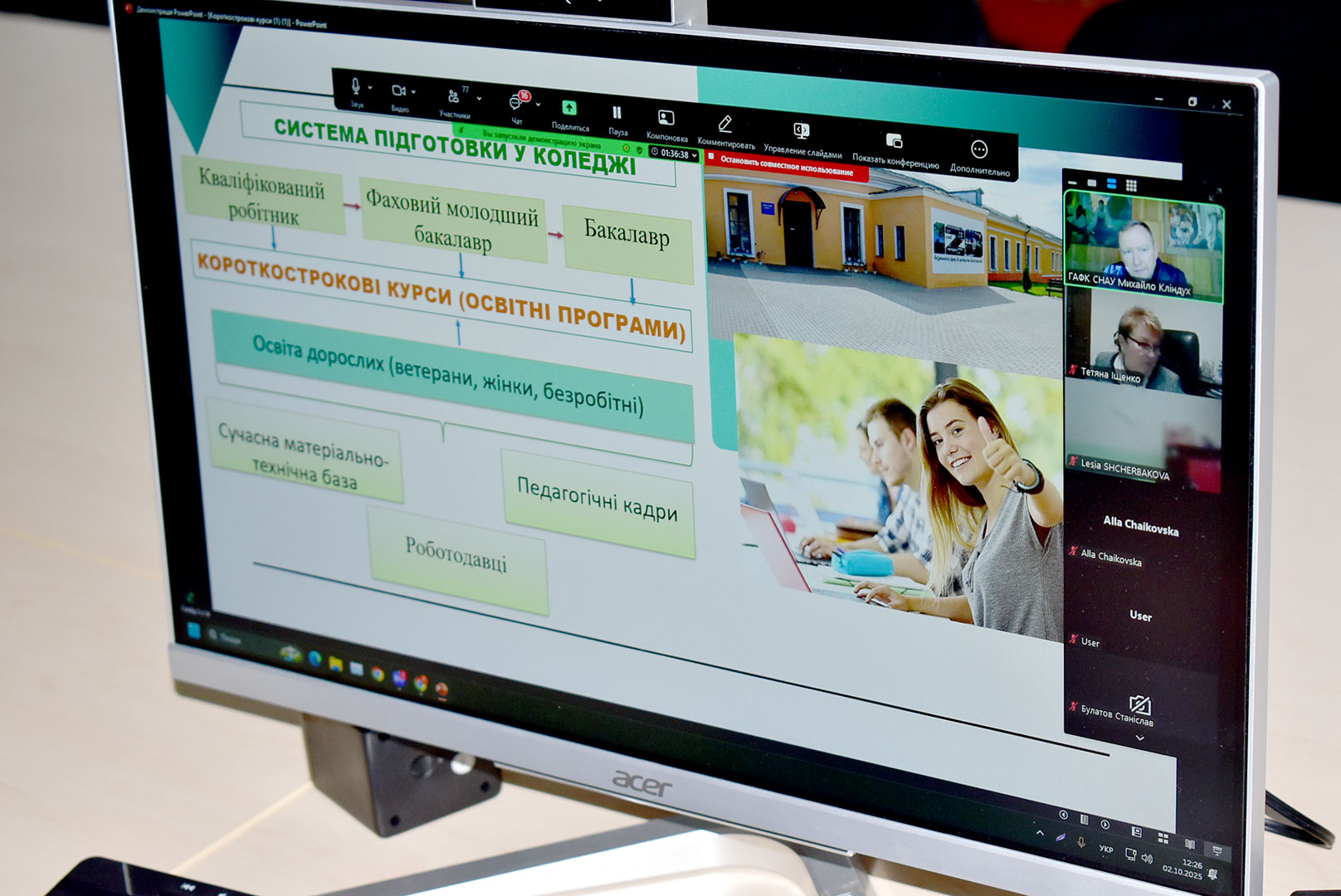 Михайло Кліндух розповів про досвід запровадження короткострокових курсів (освітніх програм) у Глухівському агротехнічному фаховому коледжі СНАУ. Під час виступу Михайла Михайловича йшлося про систему підготовки в навчальному закладі, розробку та затвердження програм і модулів курсів. Заступник директора озвучив інформацію щодо їх мети, категорії та кількості слухачів у групах тощо.