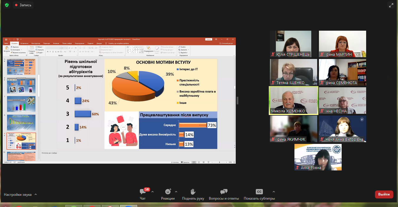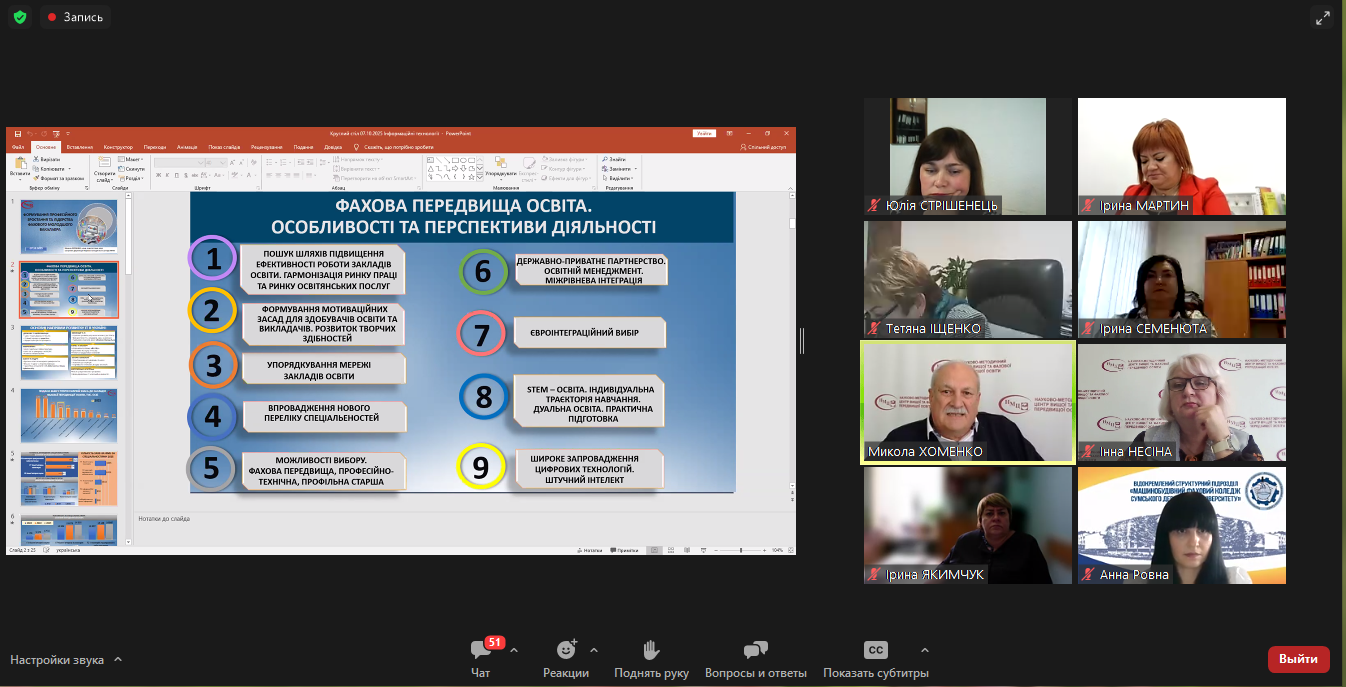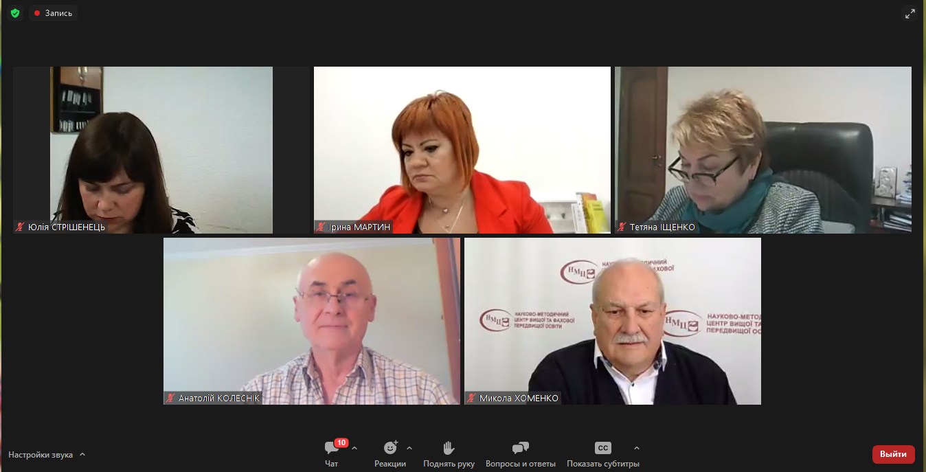 Заступник директора з навчально-методичної роботи НМЦ ВФПО Микола Хоменко надав інформацію щодо формування професійного зростання та лідерства фахового молодшого бакалавра. Йшлося про особливості та перспективи діяльності фахової передвищої освіти; кількість заяв у розрізі галузей знань і спеціальностей; фактори, які спонукали студентів вступати на ці спеціальності; середню заробітну плату в галузі тощо. Також доповідач озвучив результати попереднього анкетування, що стосувалося теми сьогоднішньої зустрічі.