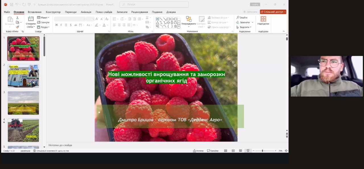 До того ж спікери ділилися досвідом органічного вирощування лохини в Карпатському регіоні й заморозки органічних ягід та овочів; результатами спільних досліджень Інституту землеробства та Іллінецького державного аграрного коледжу; кращими практиками органічних технологій; особливостями виробництва органічних чаїв, а також вирощування кавуна в умовах роботи в Краматорському районі на Донеччині. Крім цього, говорили про освітні ініціативи Липковатівського аграрного коледжу щодо органічного виробництва, сертифікацію як інструмент формування знань і компетентностей; представили навчальний посібник “Органічне землеробство”.