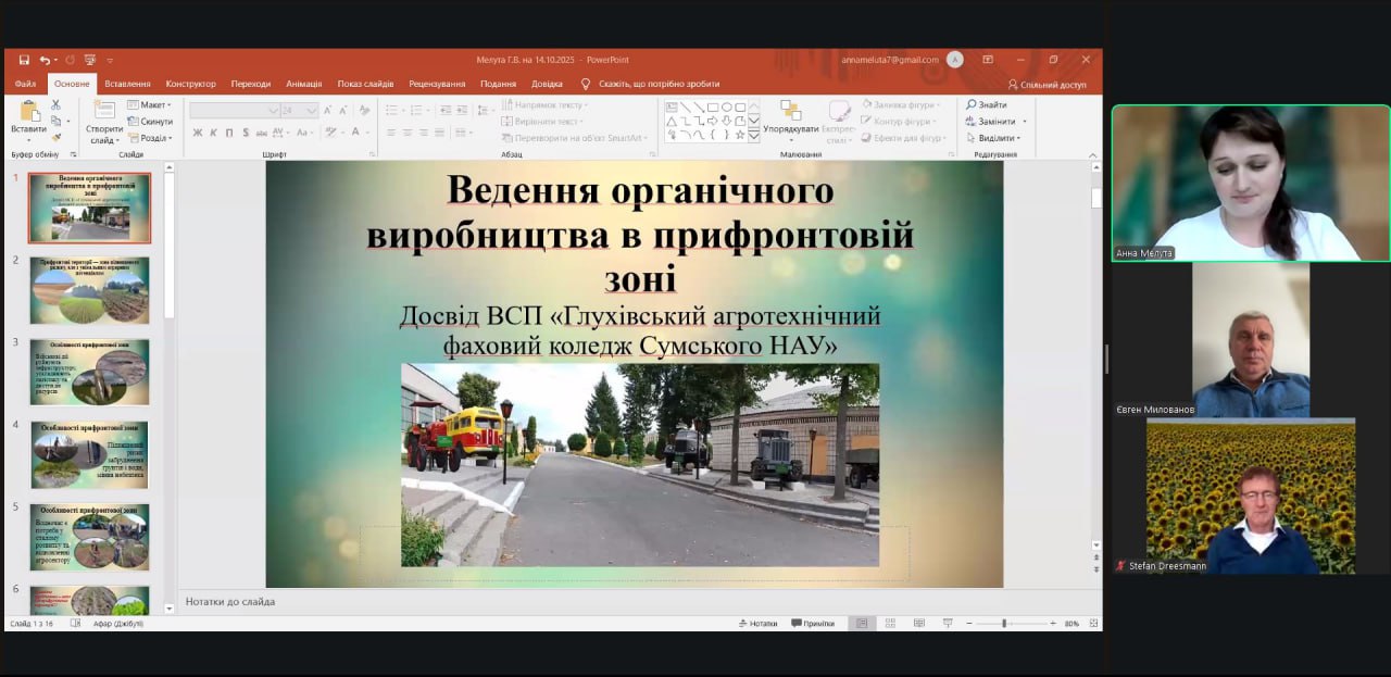 Викладачка ГАФК СНАУ Ганна Мелута поділилася з учасниками інформацією щодо ведення органічного виробництва в прифронтовій зоні. Ганна Вікторівна ознайомила з особливостями такої роботи: ускладнену логістику та доступ до ресурсів, підвищений ризик забруднення ґрунтів і води, мінну небезпеку, потребу в сталому розвитку та відновленні агросектору тощо. Акцентувала на тому, що органічне виробництво – відсутність хімічних речовин, а це знижує ризики забруднення довкілля в умовах війни та підвищує родючість ґрунтів природними методами, допомагаючи відновити деградовані землі. Пані Ганна на прикладі роботи лабораторії рослинництва коледжу розповіла про практичні методи органічного землеробства, а також звернула увагу на роль державних програм і міжнародної допомоги в розвитку органічного сектору та на необхідність інвестицій у сертифікацію, інфраструктуру й освіту.