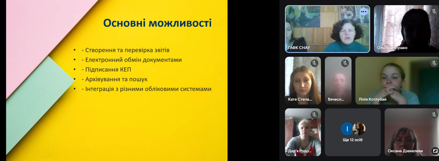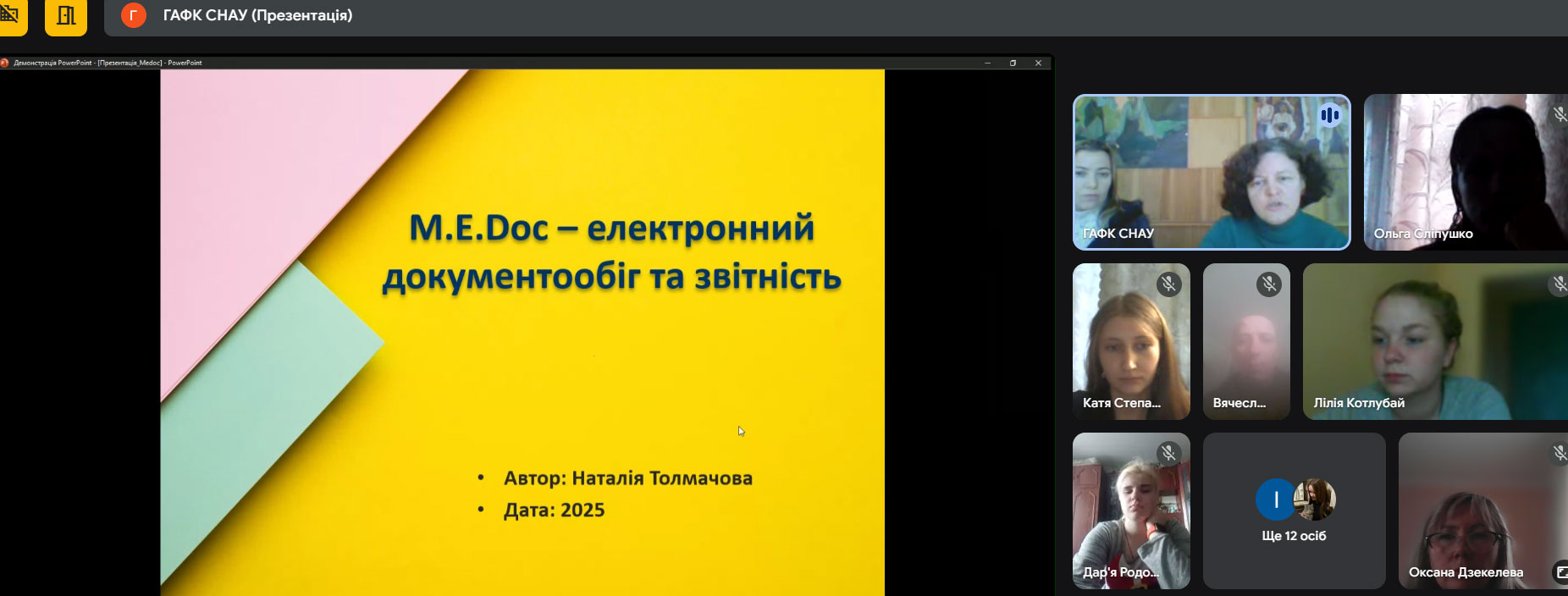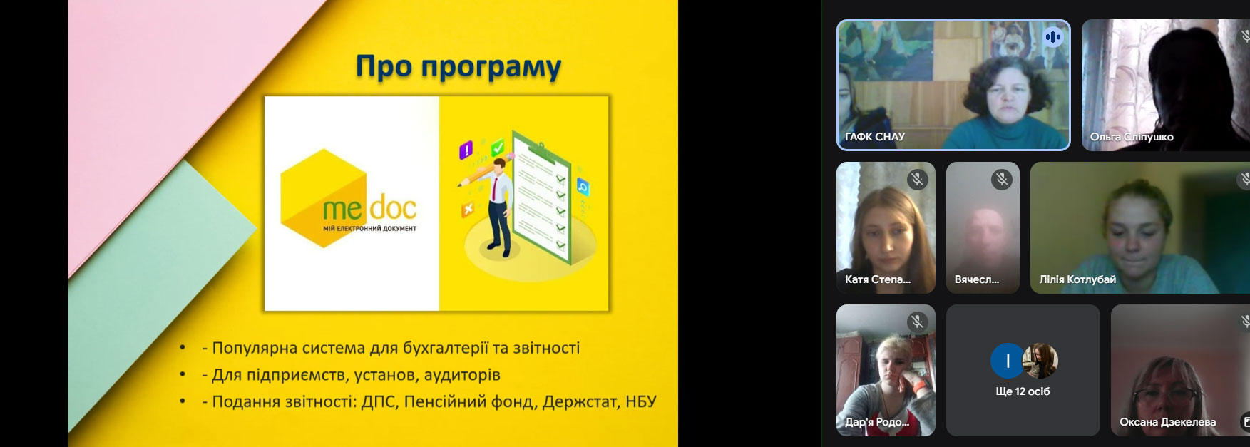 Зустріч онлайн відбулась у рамках вивчення дисципліни «Фінанси, гроші та кредит». Регіональна представниця ГК «Інтелектуальний сервіс» Наталія Толмачова надала інформацію про основні можливості програми M.E.Doc: створення та перевірка звітів, електронний обмін документами, підписання КЕП, архівування та пошук, інтеграція з різними обліковими системами.
