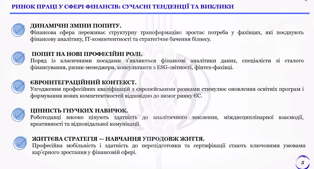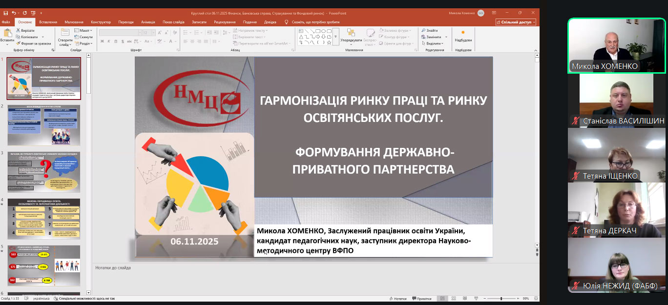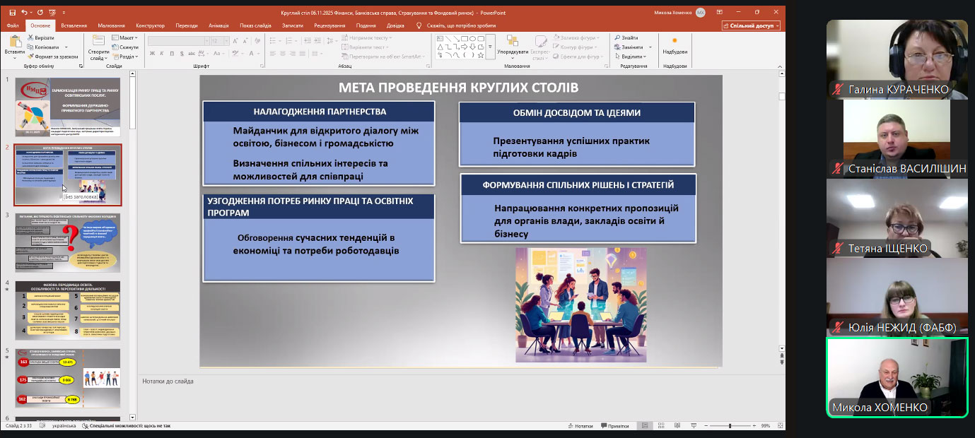 Учасники зустрічі акцентували увагу на сучасних викликах практичної підготовки фахівців зі спеціальності 072 «Фінанси, банківська справа, страхування та фондовий ринок», зокрема на шляхах співпраці зі стейкхолдерами, оновленні методичного забезпечення та розвитку партнерських відносин із роботодавцями.