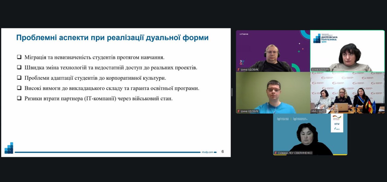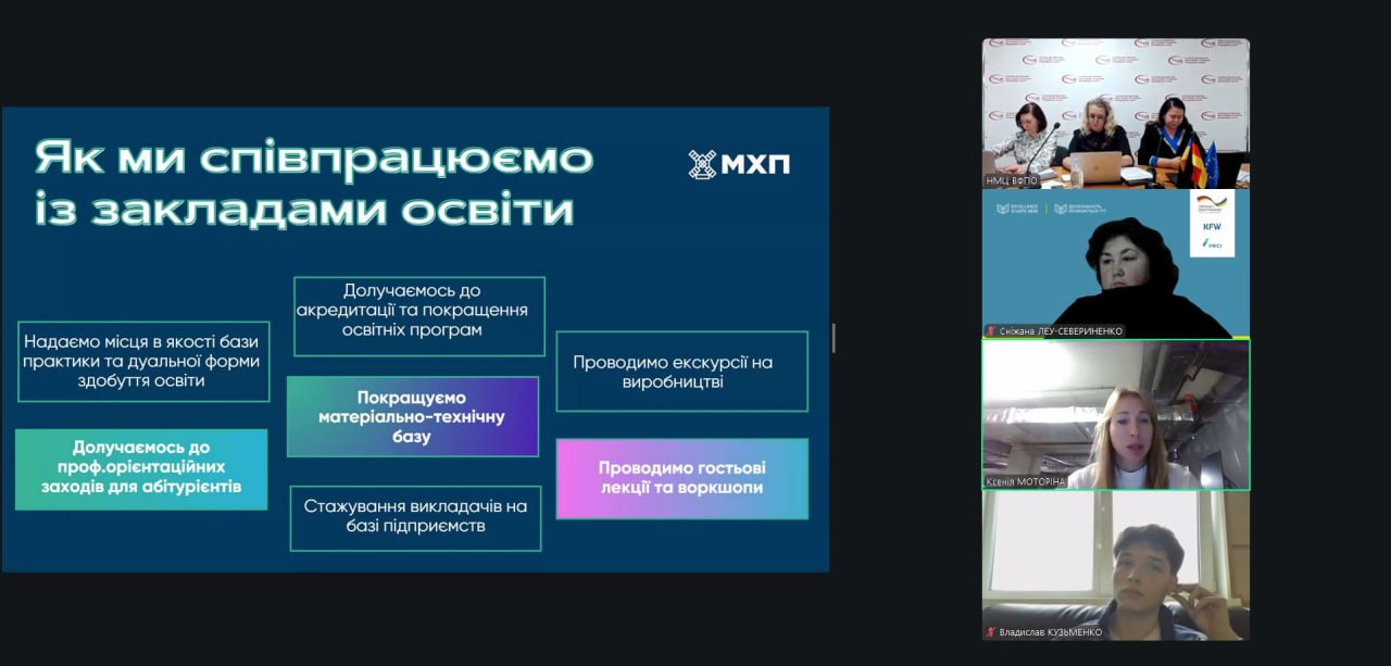 Так, серед іншого, йшлося й про секрет успіху Дніпровської політехніки щодо впровадження ДФЗО, й про взаємодію бізнесу, освіти та молоді на прикладі співпраці з ВСП «Смілянський технологічний фаховий коледж Національного університету харчових технологій», Сумським фаховим коледжем Національного університету харчових технологій і Харківським коледжем харчової промисловості тощо.