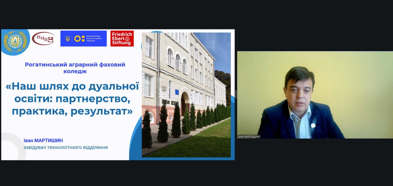 Захід, організований Міністерством освіти і науки України, ДУ «Науково-методичний центр вищої та фахової передвищої освіти» та представництвом Фонду ім. Фрідріха Еберта в Україні, об’єднав учасників для обговорення актуальних питань впровадження та розвитку дуальної форми здобуття освіти в Україні. Серед них були й завідувач відділення агроінженерії Вячеслав Чалий, завідувачка навчально-виробничими практиками Марина Чертенко та викладач Ігор Маринченко.