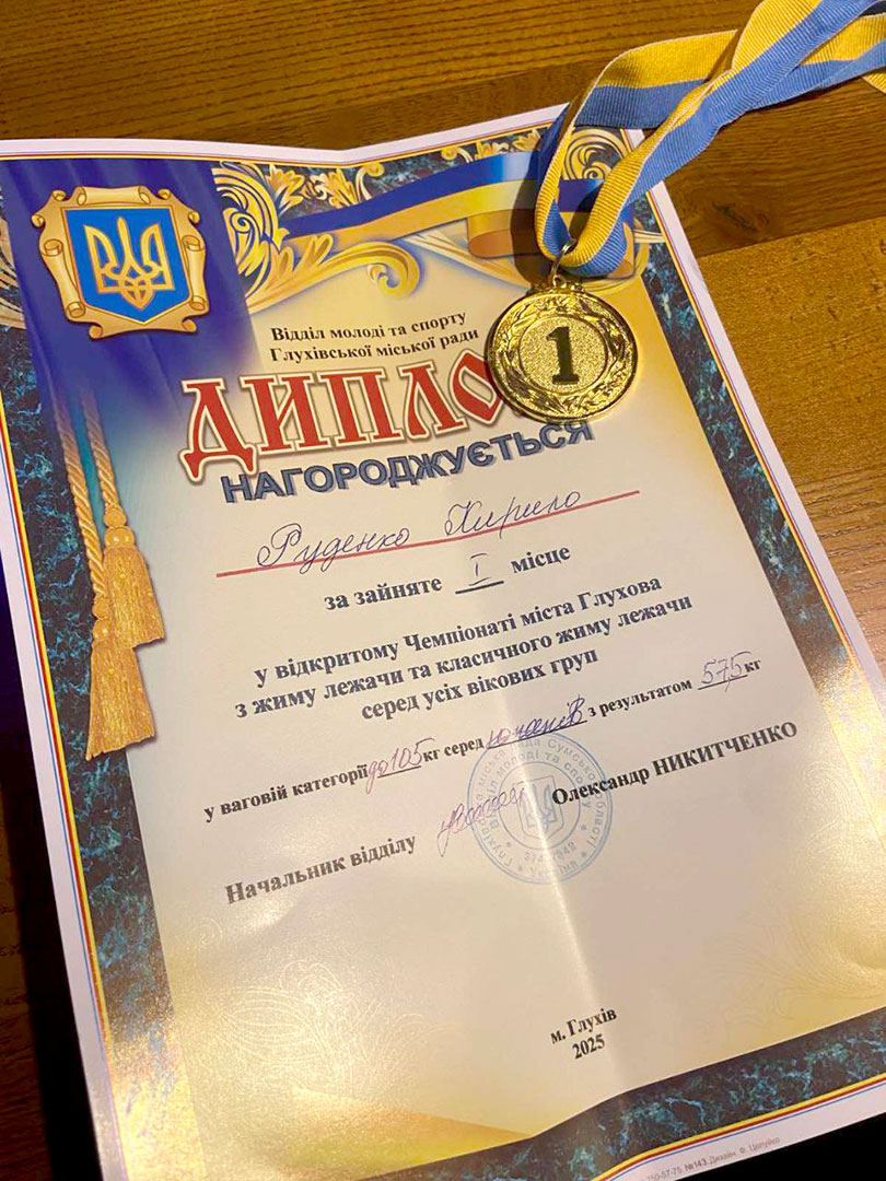 Студент 21АІ групи Кирил Руденко виборов першість на відкритому чемпіонаті міста Глухова з жиму лежачи та класичного жиму штанги лежачи серед усіх вікових груп.