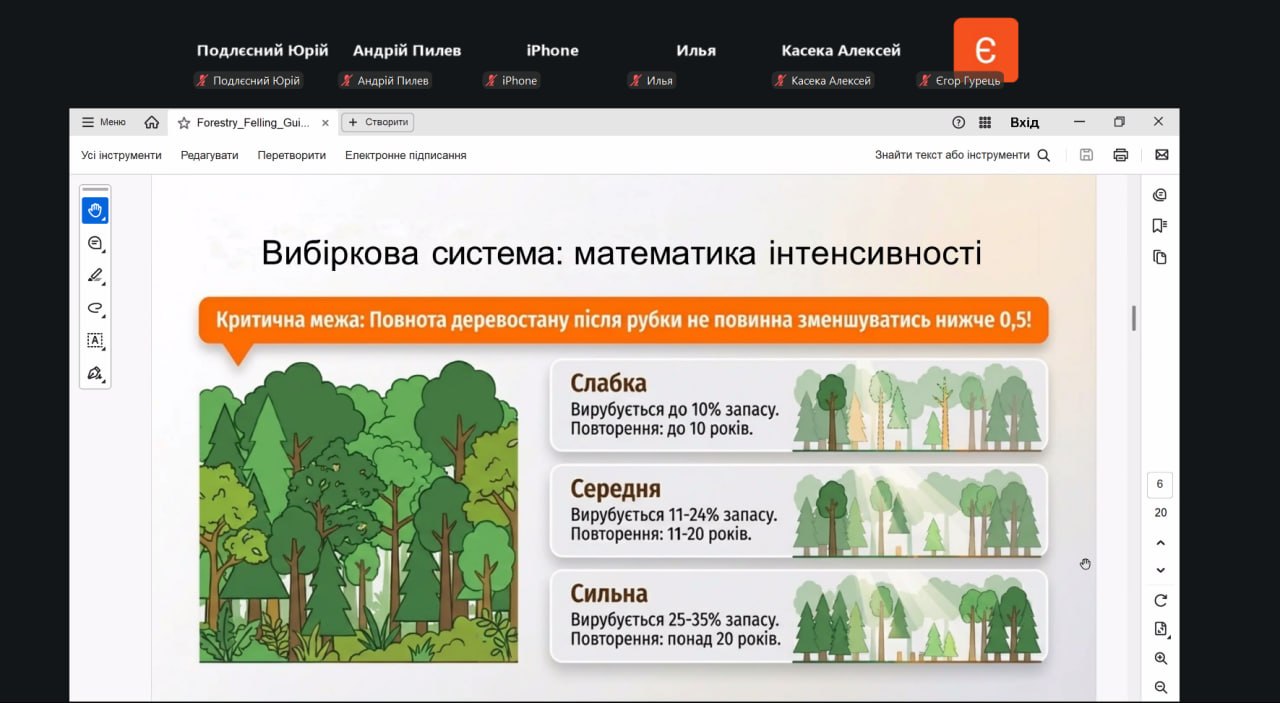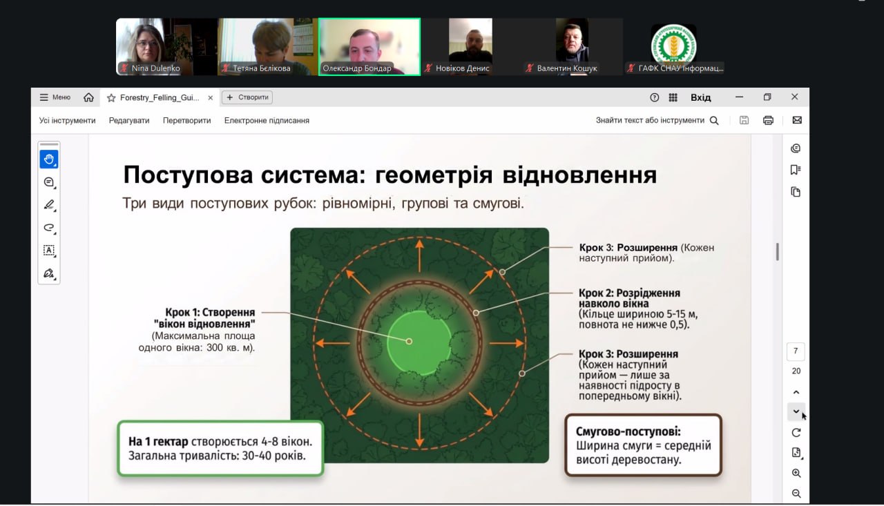 Говорячи про рівнинні ліси, лектор навів види рубок (вибіркові, суцільні, поступові, комбіновані) й детально розглянув їх роль і особливості.