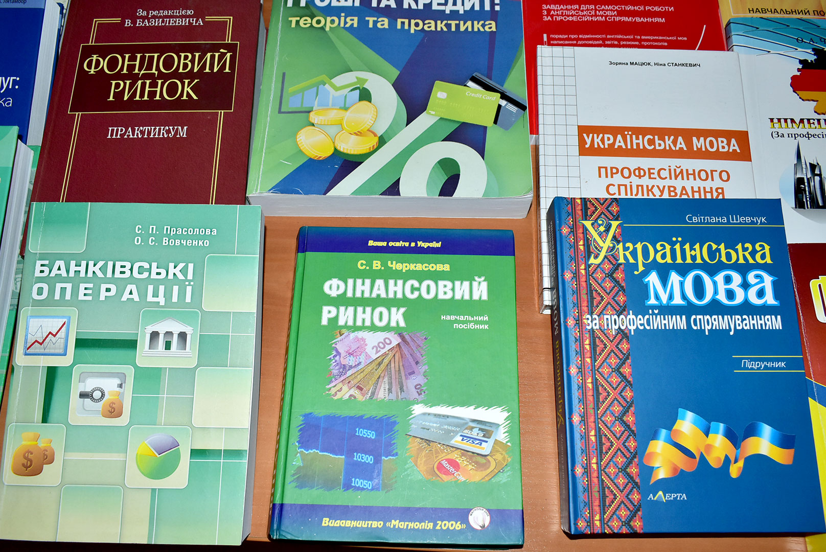 Серед запропонованого – тематичні підручники, навчальні посібники, фахові періодичні видання: Біла О.Г. Фінанси: навчальний посібник; Кремень О.І. Фінанси: навчальний посібник; Прасолова Н.П. Банківські операції: навчальний посібник та практикум; Михайловська І.М. Банківські операції. Кредитно-модульний курс: навчальний посібник; Фондовий ринок: Практикум: Навчальний посібник за ред. В.Д. Базилевича; Кравченко Ю.Я. Ринок цінних паперів: навчальний посібник.