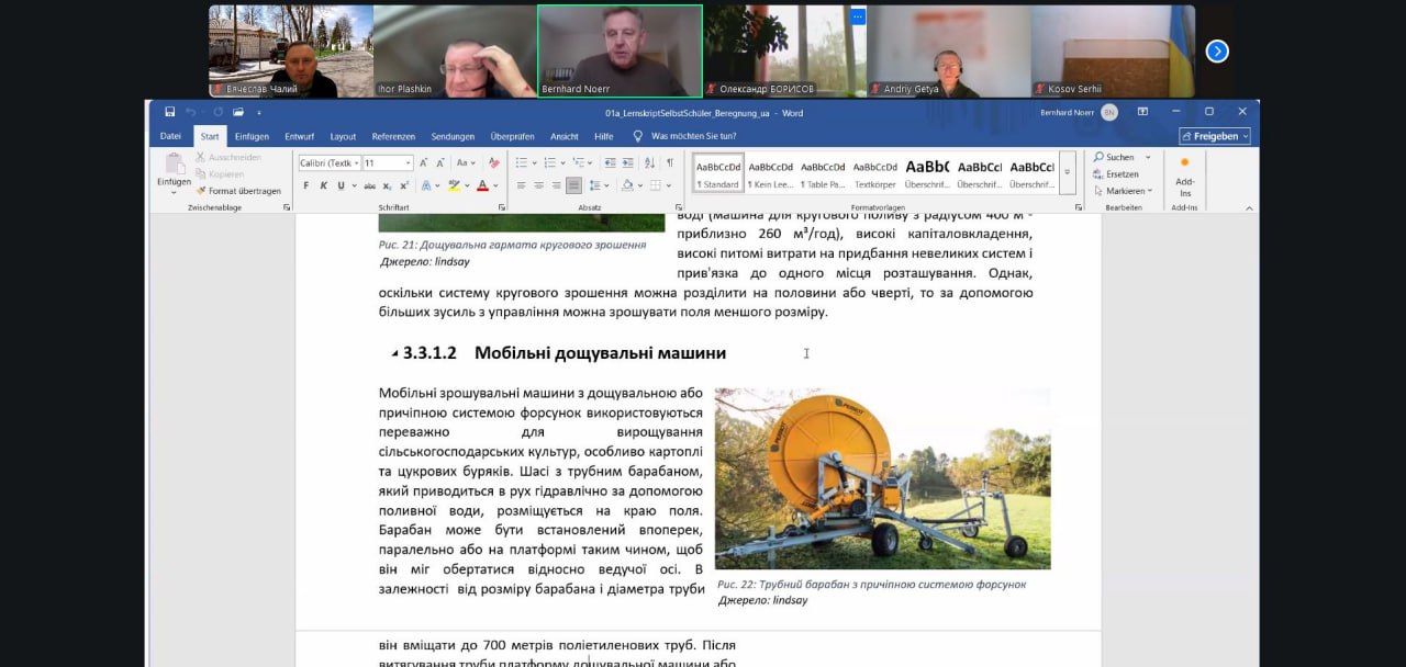 Берндт Ньор ознайомив присутніх із навчальним модулем для самостійної роботи студентів. Оглянувши зміст, розповів про основи поливу, воду для нього, види зрошення. Також спікер порівняв методи зрошення, зупинившись на дощувальному й краплинному. Виклавши важливі аспекти зрошення, детально розповів про дощувальну машину.