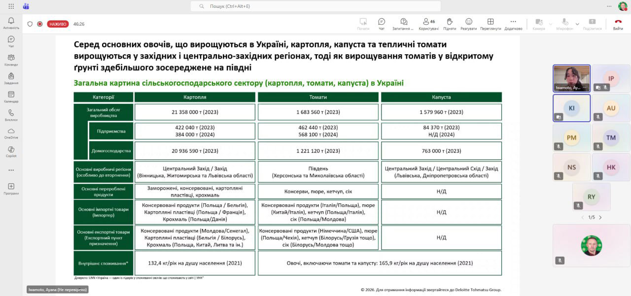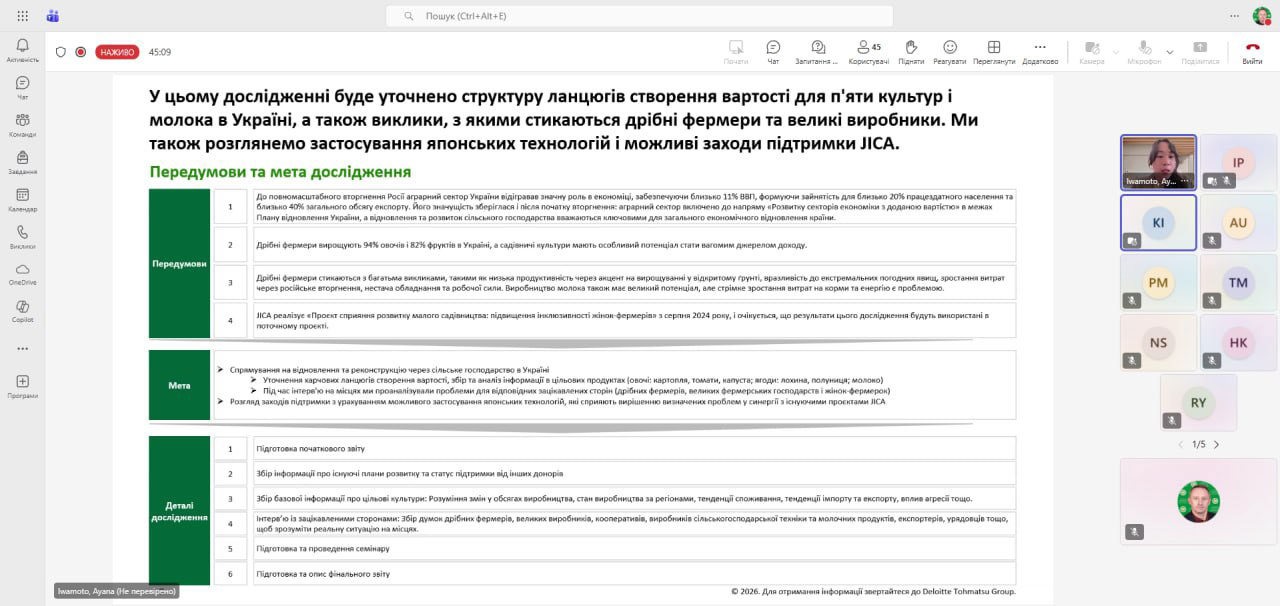 Дослідження харчових ланцюгів створення вартості, замовлене JICA (Японським агентством міжнародного співробітництва) у компанії Deloitte Tohmatsu LLC (Японія), має на меті підтримати відновлення та відбудову України через сільське господарство.
