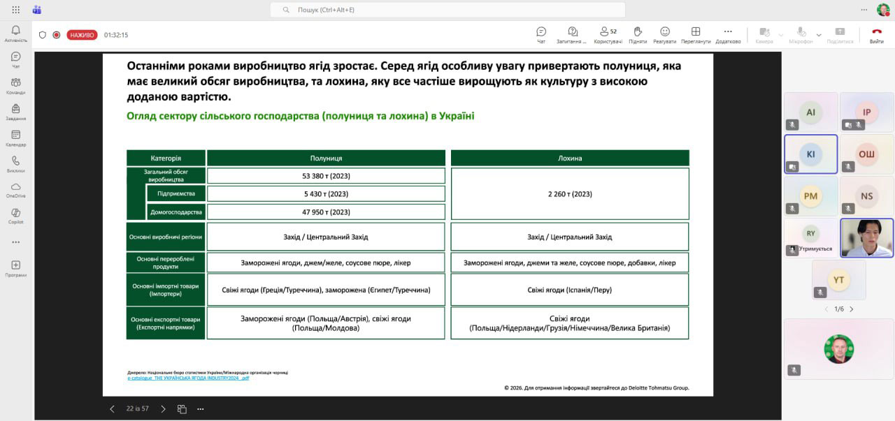 Учасники зібрання дізналися про передумови проєкту й ознайомилися з викликами харчових ланцюгів створення вартості овочів (картопля, помідори, капуста), ягід (лохина, полуниця) та молока. По кожній групі були озвучені заходи підтримки.