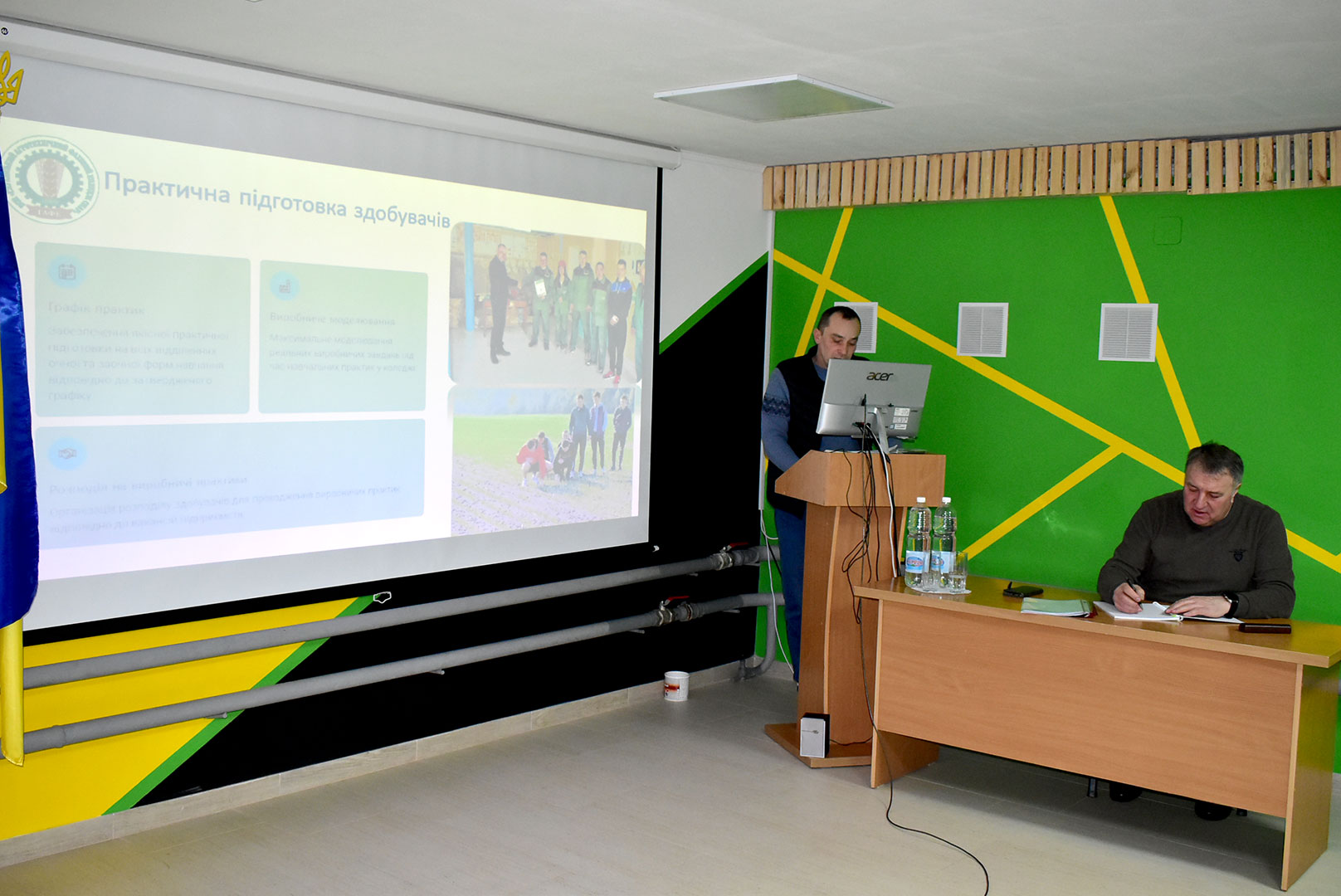 Олександр Олександрович говорив про графік практик, виробниче моделювання, партнерство зі стейкхолдерами, моніторинг практичної підготовки, опитування здобувачів освіти, працевлаштування та кар’єрне зростання, ліцензування нових професій, підготовку водіїв автотранспортних засобів і фахівців робітничих професій. Також розповів щодо практики, дослідницької та польової робіт на навчальній лабораторії рослинництва, технічного забезпечення цих процесів.
