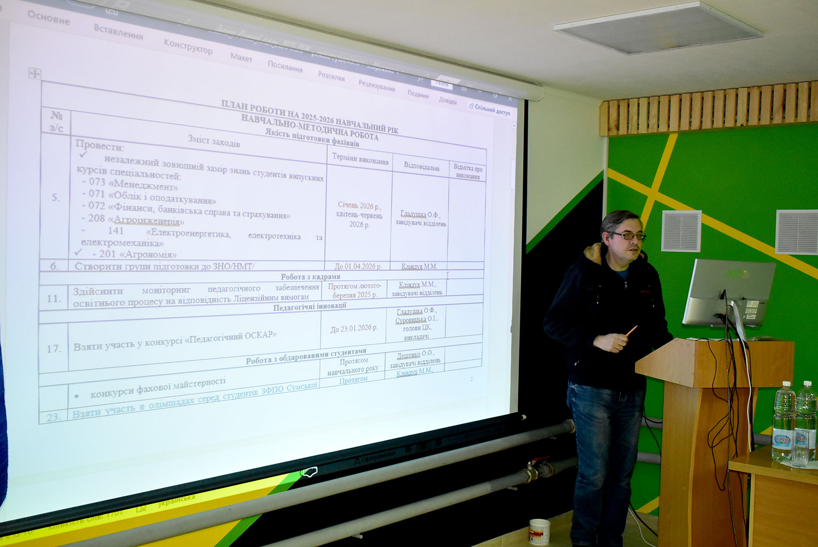 Методист ГАФК СНАУ Олександр Гладушка запропонував розглянути й ухвалити зміни, внесені до плану роботи коледжу в ІІ семестрі 2025-2026 н/р, а завідувачка навчально-методичного кабінету Олена Суровицька – затвердити план підвищення кваліфікації на 2026 рік і результати підвищення кваліфікації педагогічних працівників.