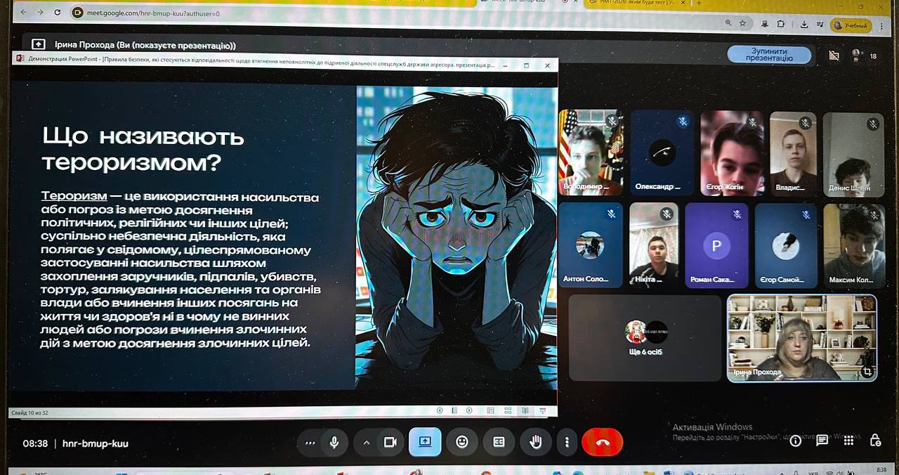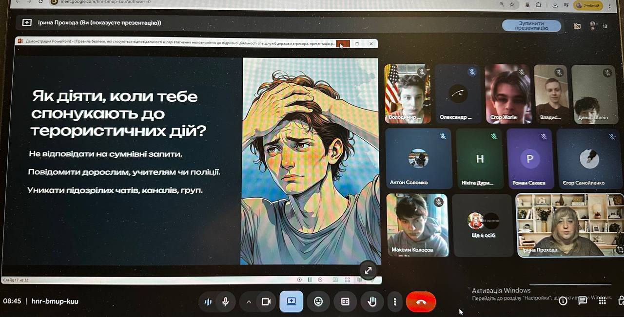 Під час зустрічі кураторка групи Ірина Прохода ознайомила студентів із поняттями тероризму, диверсії та підривної діяльності, розкрила їхні основні форми, зокрема фізичне насильство, кібератаки, пропаганду, а також пояснила, чому саме підлітки часто стають мішенню для маніпуляцій з боку ворожих спецслужб.