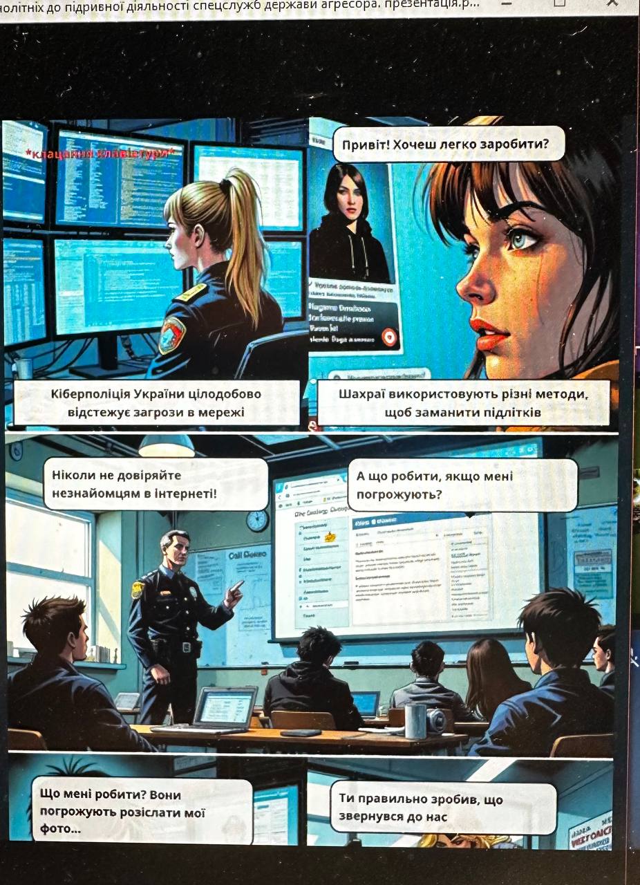 Особливу увагу приділили практичним прикладам та інтерактивним методам роботи. Студенти переглянули й обговорили тематичні комікси, поділилися власними думками та висновками, активно долучилися до бесіди про небезпеки в інтернеті, соціальних мережах і способи розпізнавання маніпулятивних пропозицій.