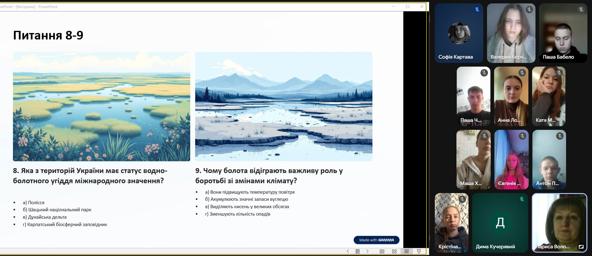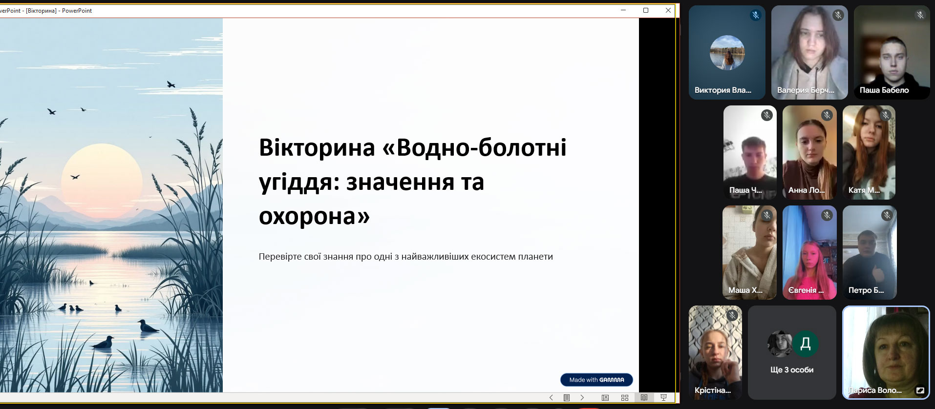 Студенти ознайомилися з актуальною інформацією про значення водно-болотних угідь, їхню роль у підтриманні біорізноманіття, регулюванні водного режиму та протидії змінам клімату. За словами Лариси Анатоліївни, особливий інтерес викликали цікаві факти про болота України та світу, а також приклади водно-болотних угідь міжнародного значення.