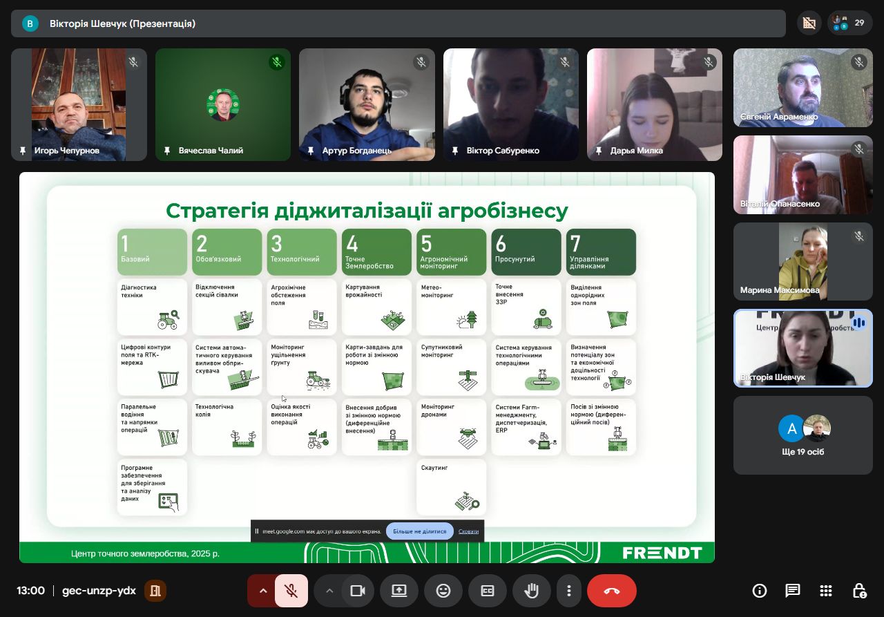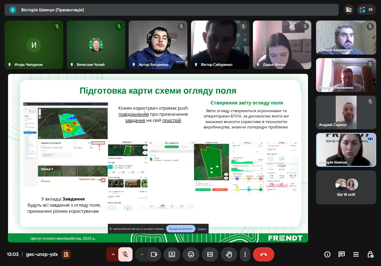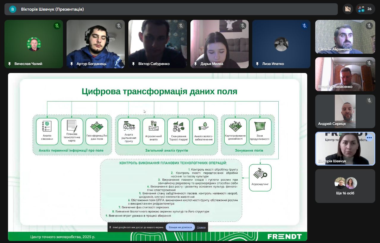 Агроном-аналітик, менеджер-організатор відділу точного землеробства ТОВ «ФРЕНДТ» Вікторія Шевчук поділилася зі студентами досвідом впровадження точного землеробства. Зокрема йшлося про історію підприємства, основні напрямки роботи, стратегію діджиталізації агробізнесу, методологію впровадження та систему точного землеробства.