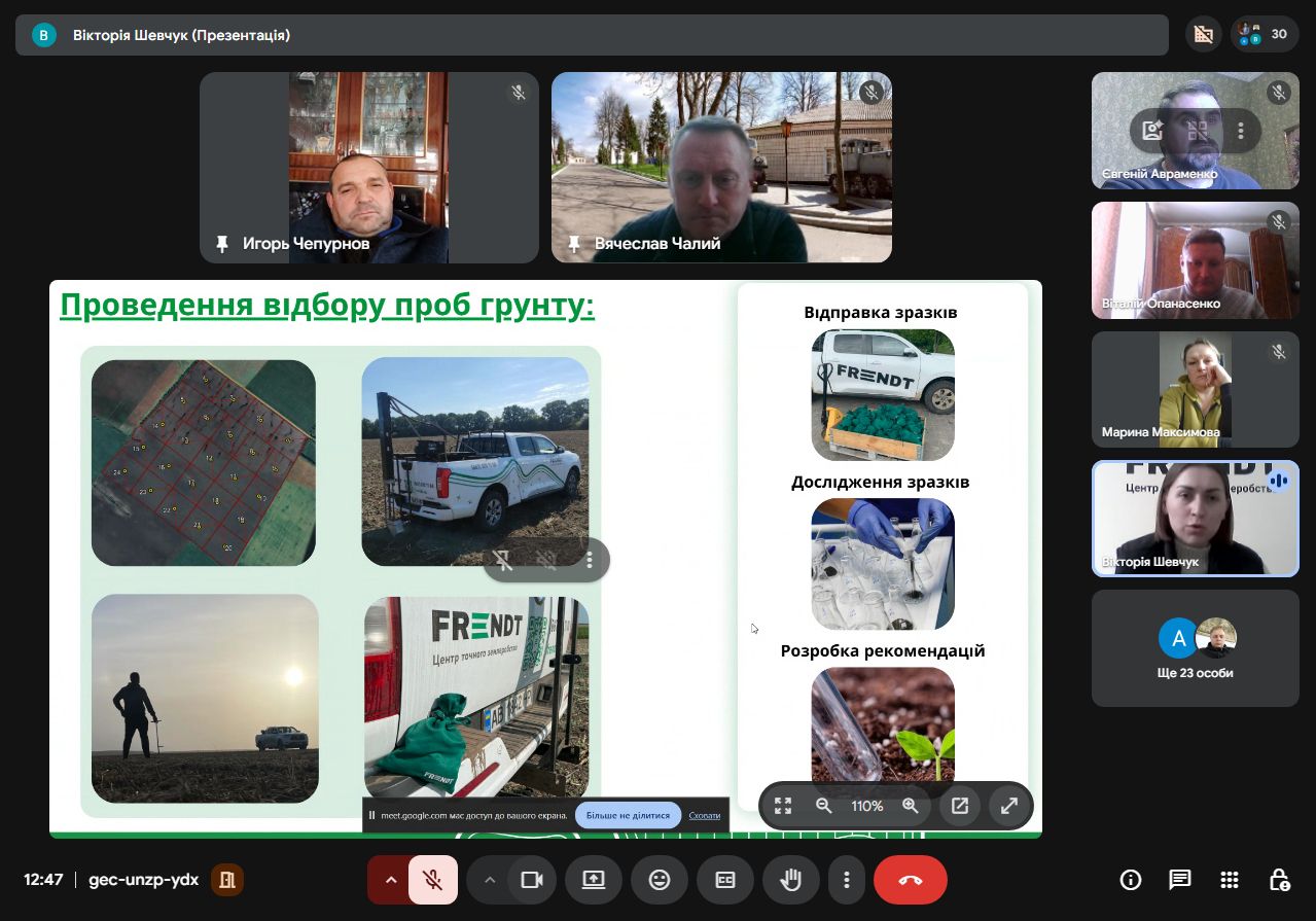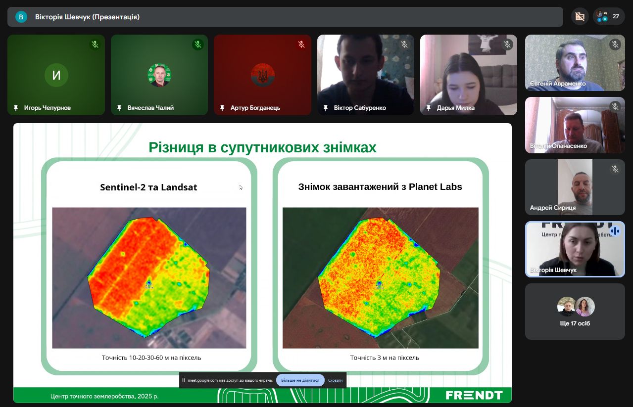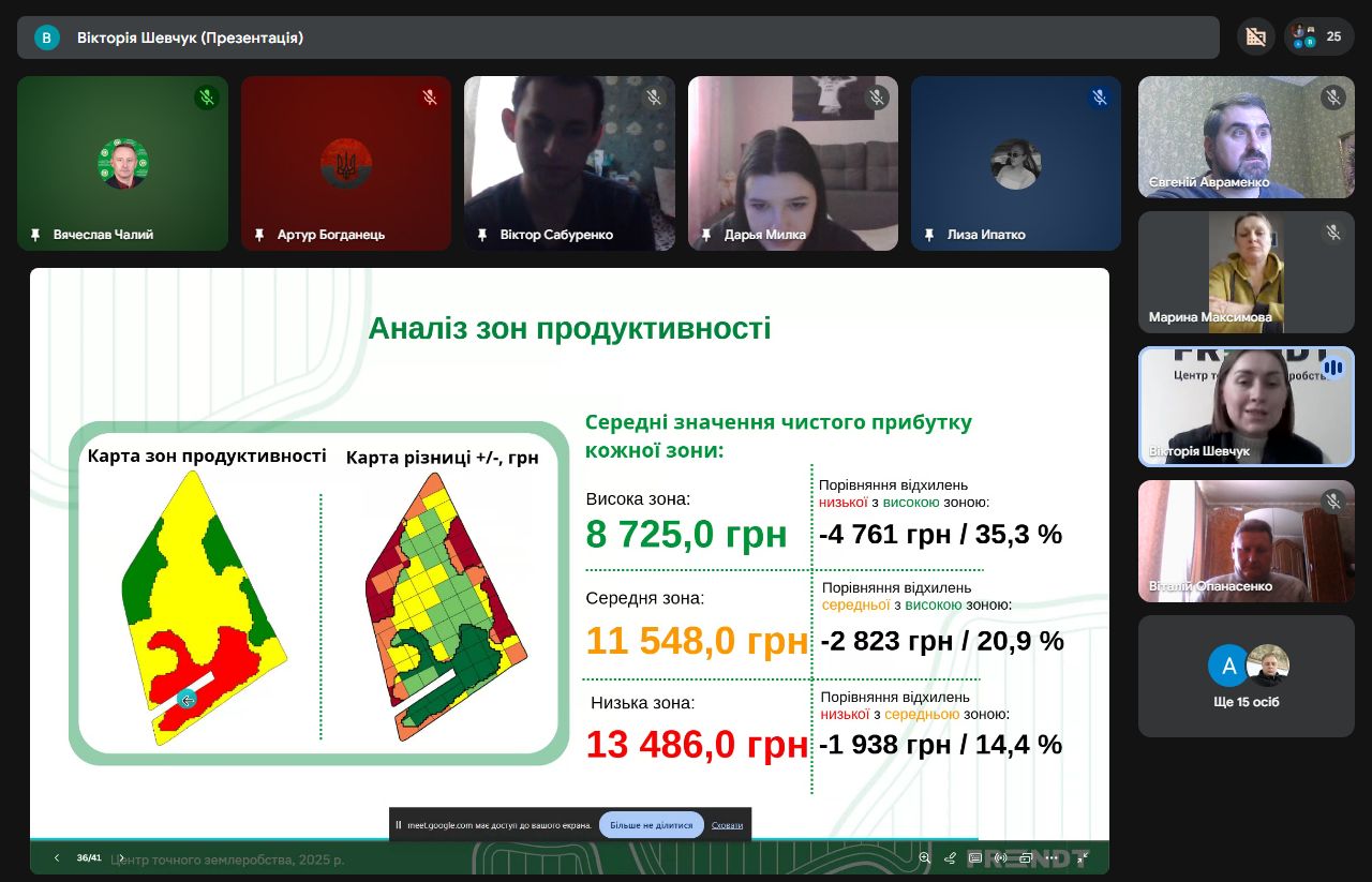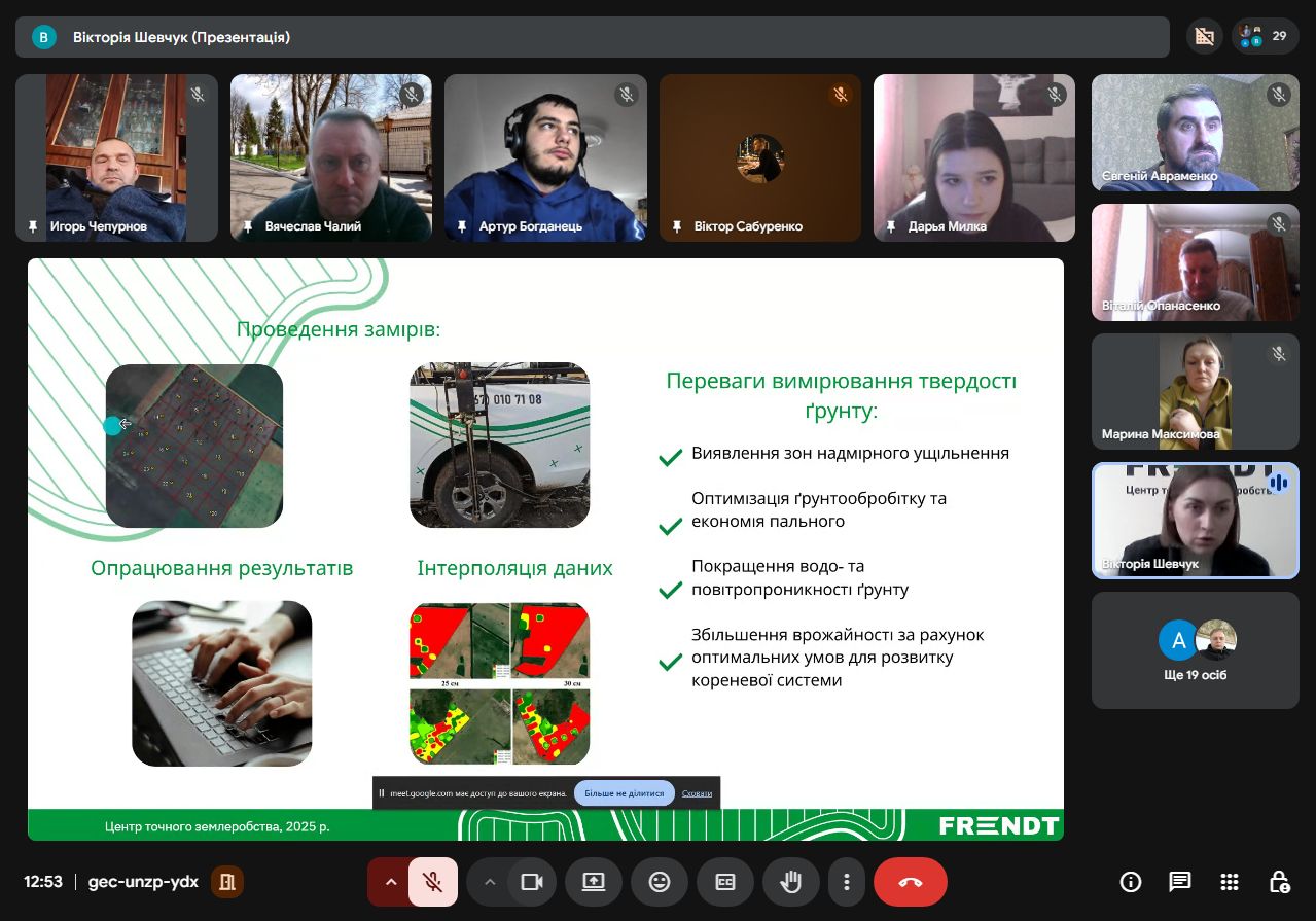 Агроном-аналітик, менеджер-організатор відділу точного землеробства ТОВ «ФРЕНДТ» Вікторія Шевчук поділилася зі студентами досвідом впровадження точного землеробства. Зокрема йшлося про історію підприємства, основні напрямки роботи, стратегію діджиталізації агробізнесу, методологію впровадження та систему точного землеробства.