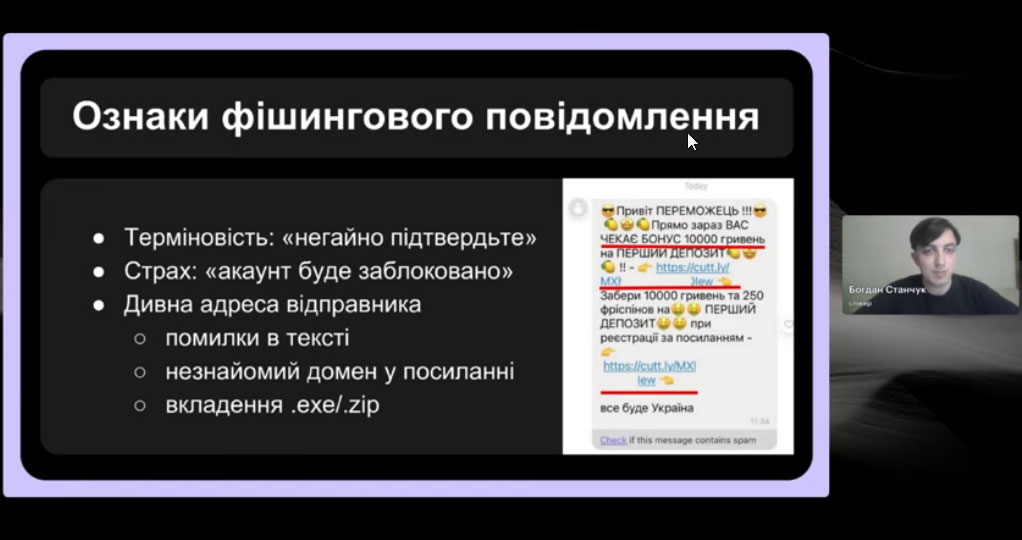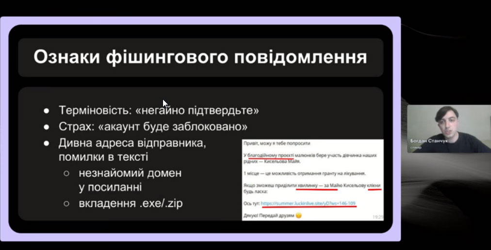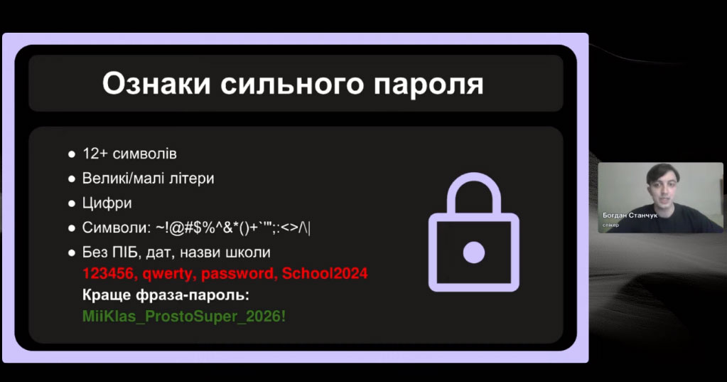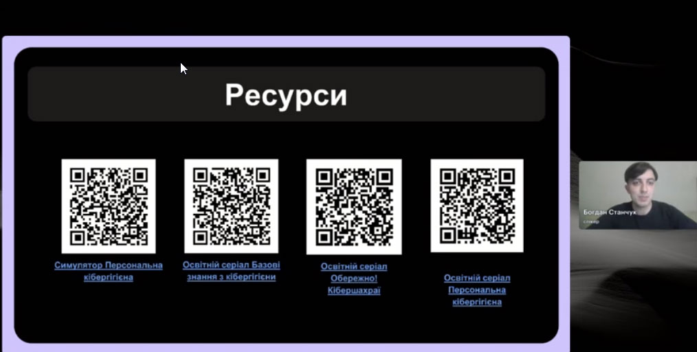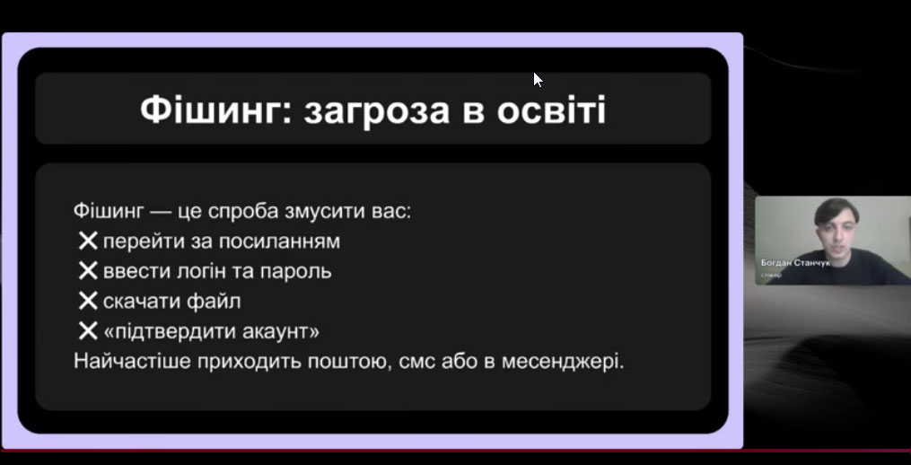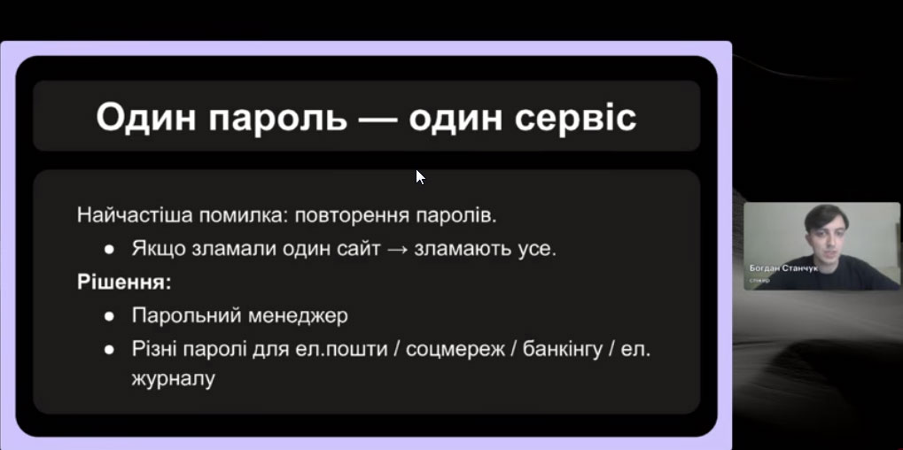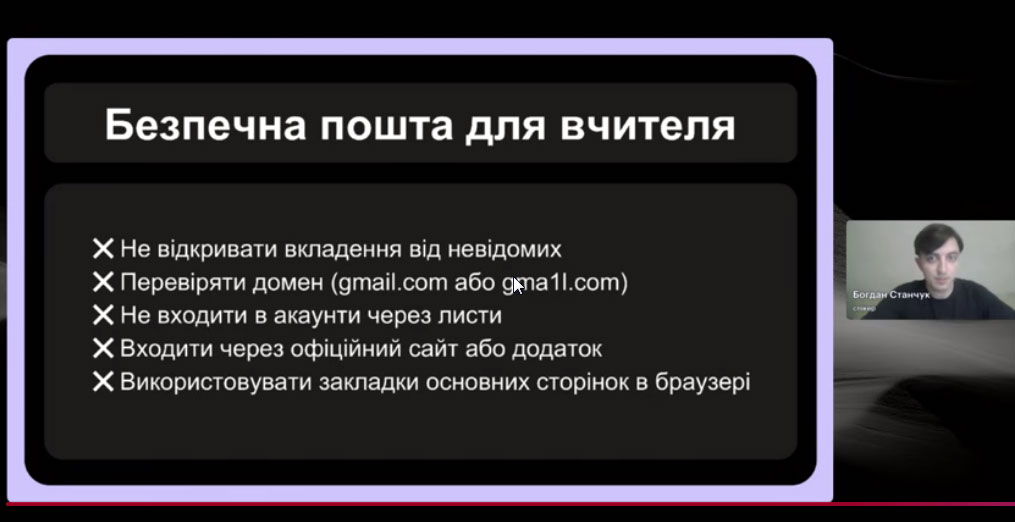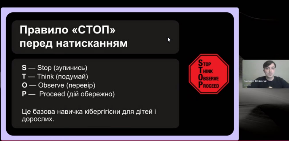 Спікер зустрічі, випускник програми «Навчай» від ГО «Навчай для України» Богдан Станчук розповів про основні принципи безпечної роботи онлайн і кібергігієни; пояснив, як безпечно використовувати штучний інтелект у роботі; дав практичні поради та чекліст простих дій для захисту себе, учнів і даних.