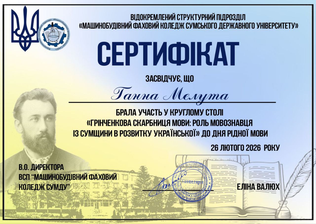 Голова циклової комісії гуманітарних дисциплін Глухівського агротехнічного фахового коледжу СНАУ Ганна Мелута взяла участь у круглому столі «Грінченкова скарбниця мови: роль мовознавця із Сумщини в розвитку української».