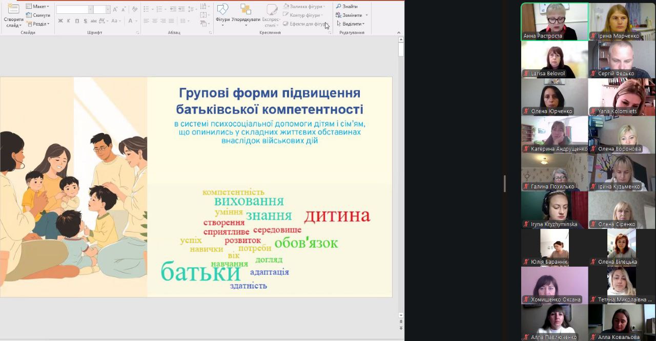 Зустріч була присвячена обговоренню питання підвищення батьківської компетентності в системі надання допомоги сім'ям, які опинилися в складних життєвих обставинах внаслідок військових дій. Під час виступу методист центру Анна Растроста ознайомила присутніх із основними компонентами батьківської підтримки дітей.