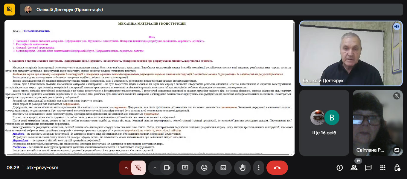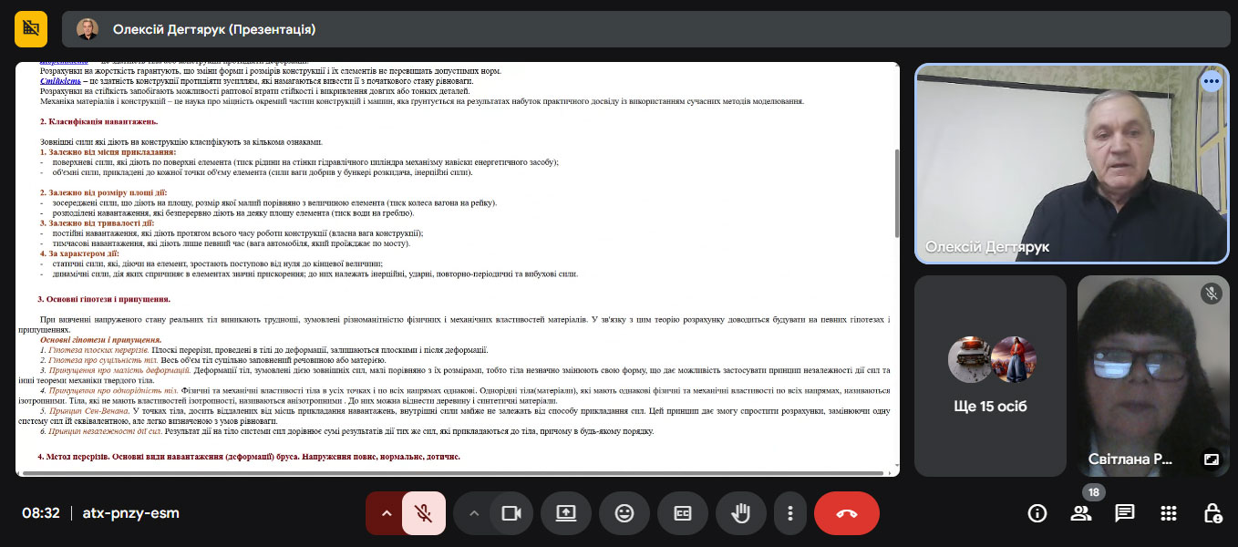 Під час лекції розглянули головні теоретичні основи механіки матеріалів, зокрема поняття напруження, деформації, пружності, пластичності та міцності конструкційних матеріалів. Лектор детально пояснив принципи роботи елементів конструкцій під дією різних навантажень і навів практичні приклади, що ілюструють застосування цих знань у проєктуванні та експлуатації машин і механізмів аграрного призначення.