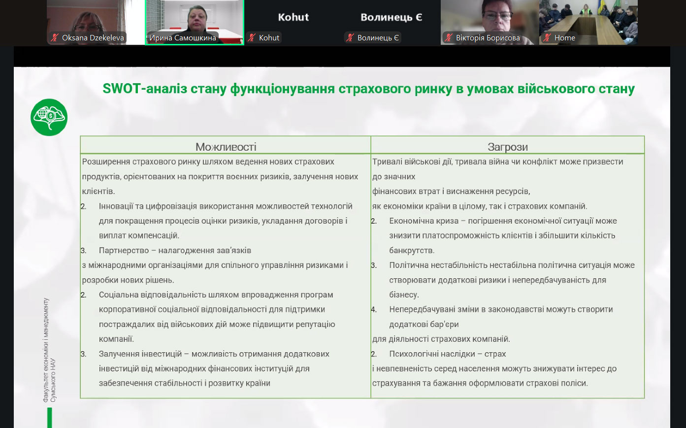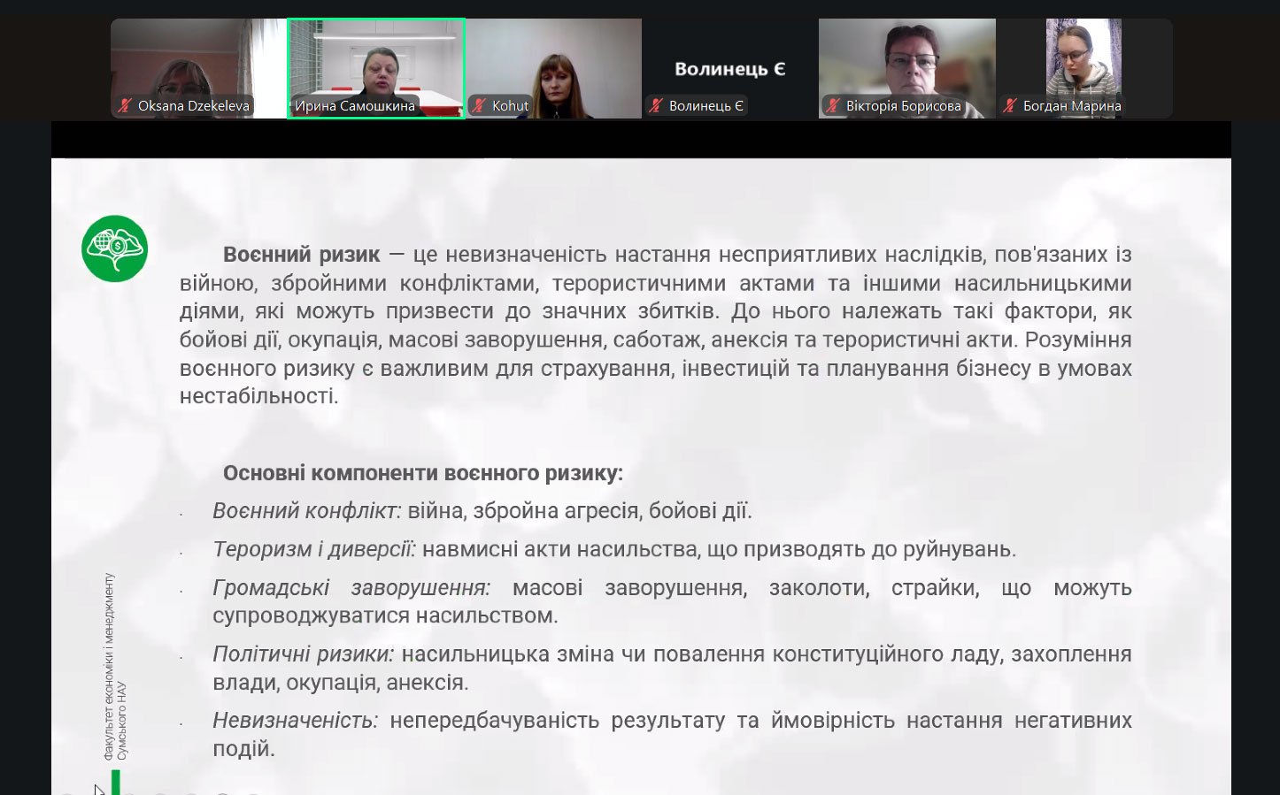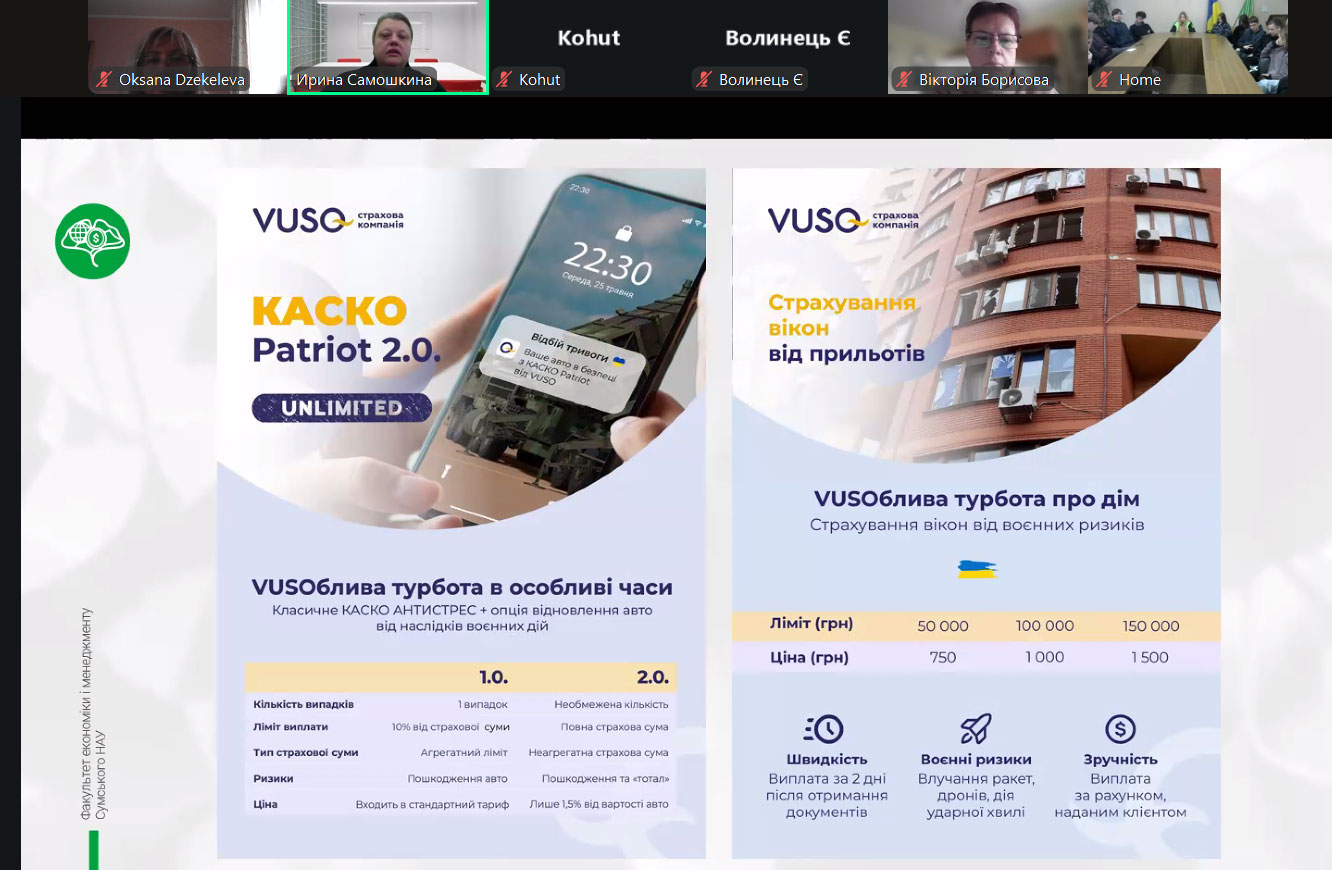 Кандидат економічних наук, доцент кафедри фінансів та страхування Сумського національного аграрного університету Ірина Самошкина розповіла про види військових ризиків. Також на лекції йшлося про досвід страхування військових ризиків інших країн світу й міжнародні механізми страхування військових ризиків. До того ж майбутні фінансисти дізналися про системи управління ризиками та особливості страхування на прикордонних територіях й особливості напрямків державної політики та підтримки прикордоння.