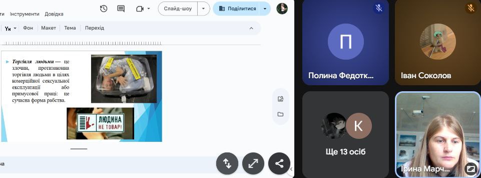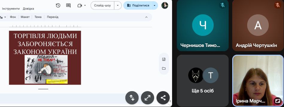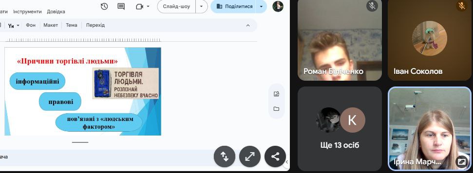 Підсумовуючи заняття, Ірина Владиславівна наголосила на основних способах, які допоможуть вберегтися від торгівлі людьми та звернула увагу на різні варіанти реагування в разі вчинення протиправних дій стосовно людини, небезпеки життя та незаконного залучення з метою експлуатації.