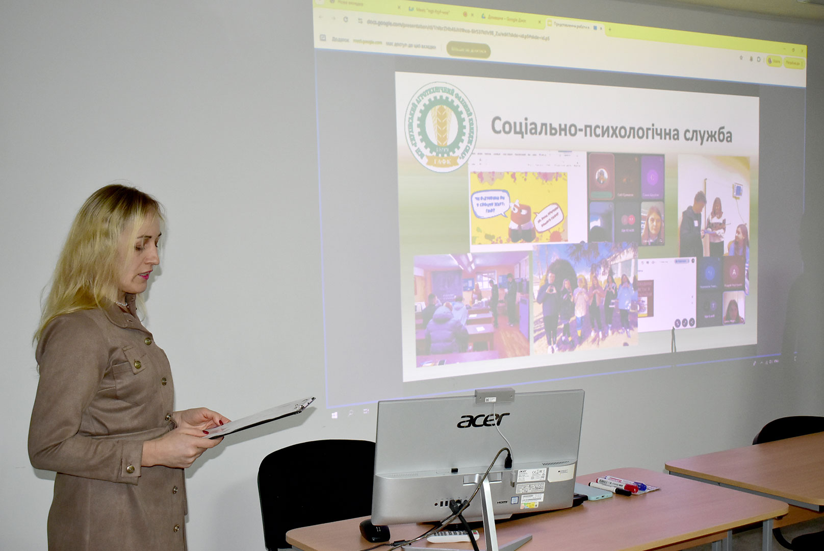 Заступник директора з виховної роботи Ірина Хлонь розповіла, хто входить до виховного відділу та чим він займається. Зокрема йшлося про соціально-психологічну службу, сектор культурно-масової роботи, Центр молодіжної політики, а також такі напрями як волонтерська робота, розвиток талантів студентів, культурно-масові заходи, відзначення учасників громадського та спортивного життя коледжу тощо. Крім цього, Ірина Вікторівна зазначила, що невід’ємною частиною їх роботи є всебічне виховання молоді, реалізація творчого потенціалу, їх психологічна підтримка.