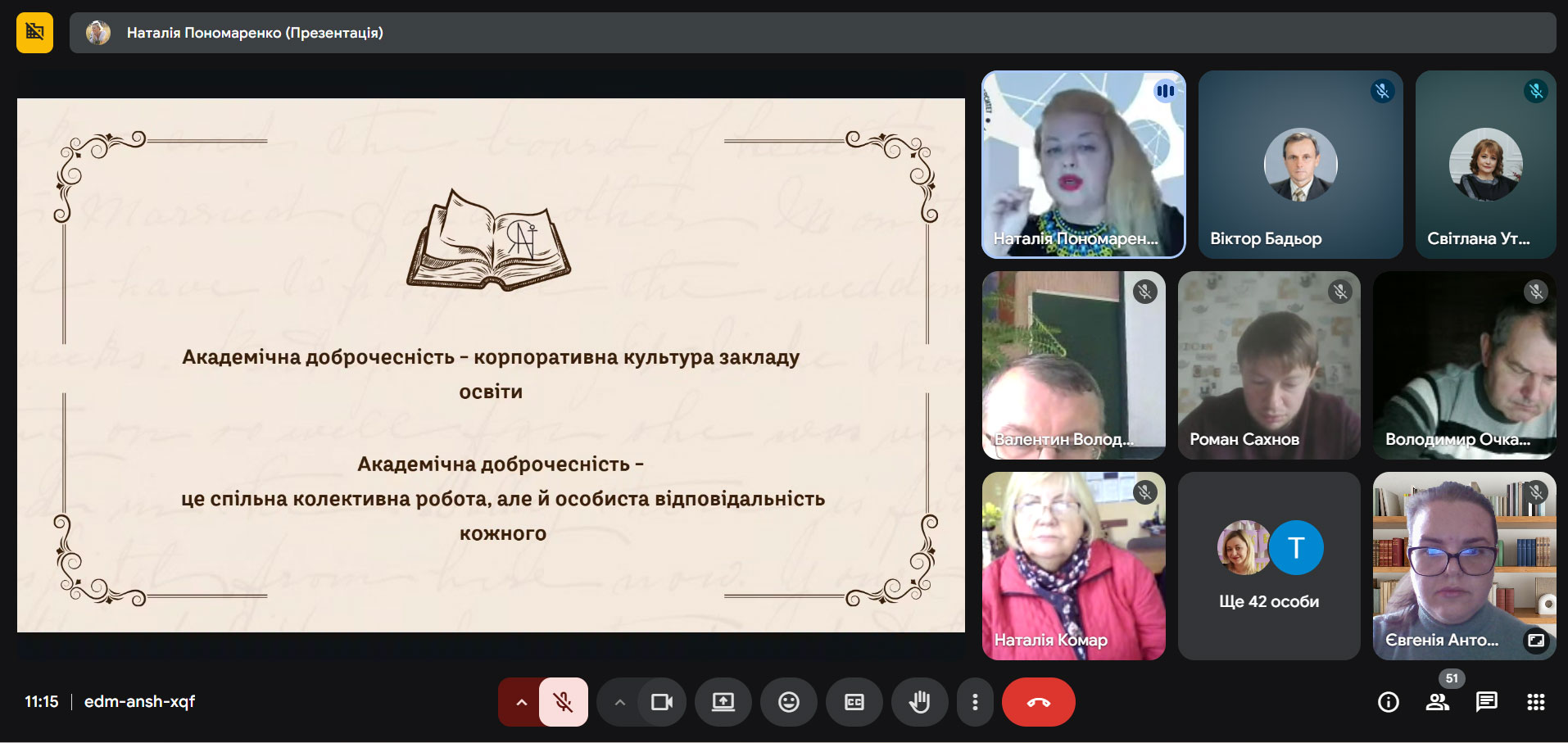 Засідання розпочалося з виступу Наталії Пономаренко, старшої викладачки кафедри журналістики та філології СумДУ та медіатренерки, яка ознайомила присутніх з основами інфомедійної грамотності та надала поради стосовно виявлення фейкових новин і протидії проявам академічної недоброчесності.