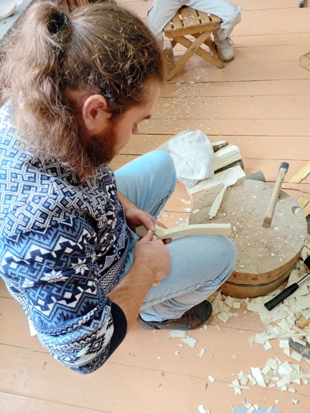 Перетворюючи дерев’яну заготовку на козацький побутовий предмет, першокурсники працювали сокирою, напівкруглою стамескою і ложковим різцем.