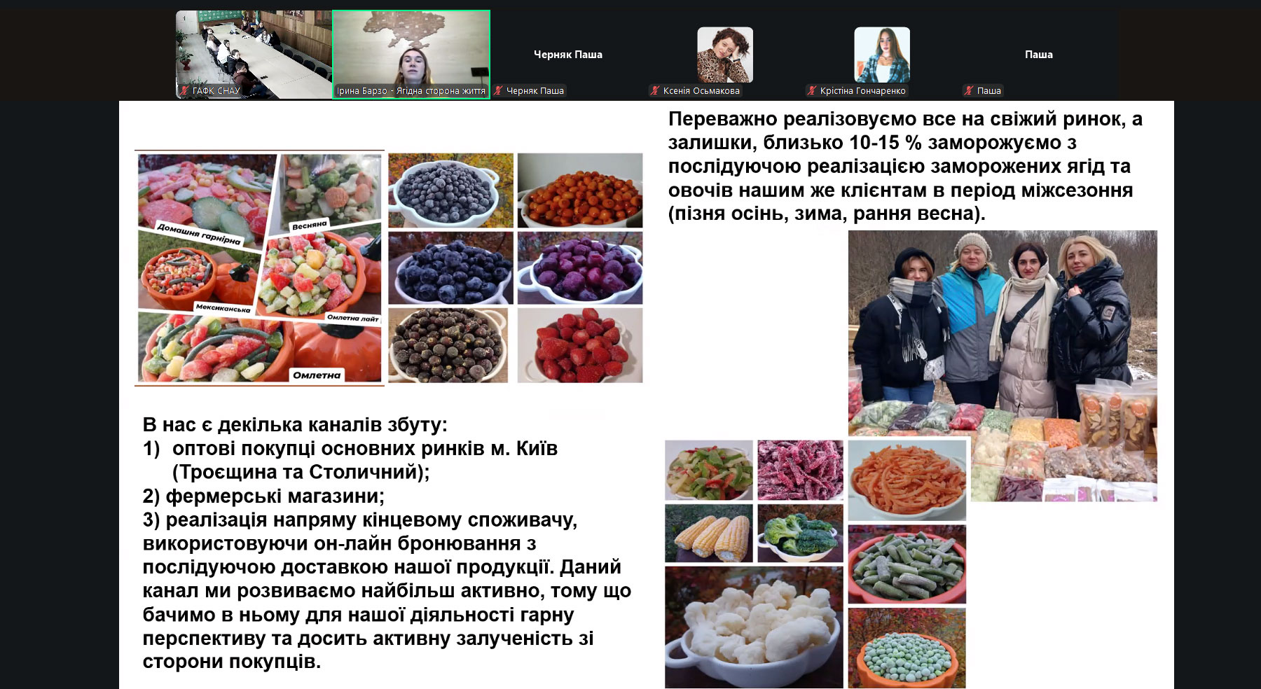 Гостя підкреслила, що, починаючи власну справу, в першу чергу, треба думати про ринки збуту й навела три власні напрями: оптові покупці основних ринків, фермерські магазини, реалізація кінцевому споживачу напряму з онлайн-бронюванням. Також поділилася лайфхаком, який дозволяє підприємству мати дохід від реалізації ягід і овочів круглий рік: заморожування залишків продукції.