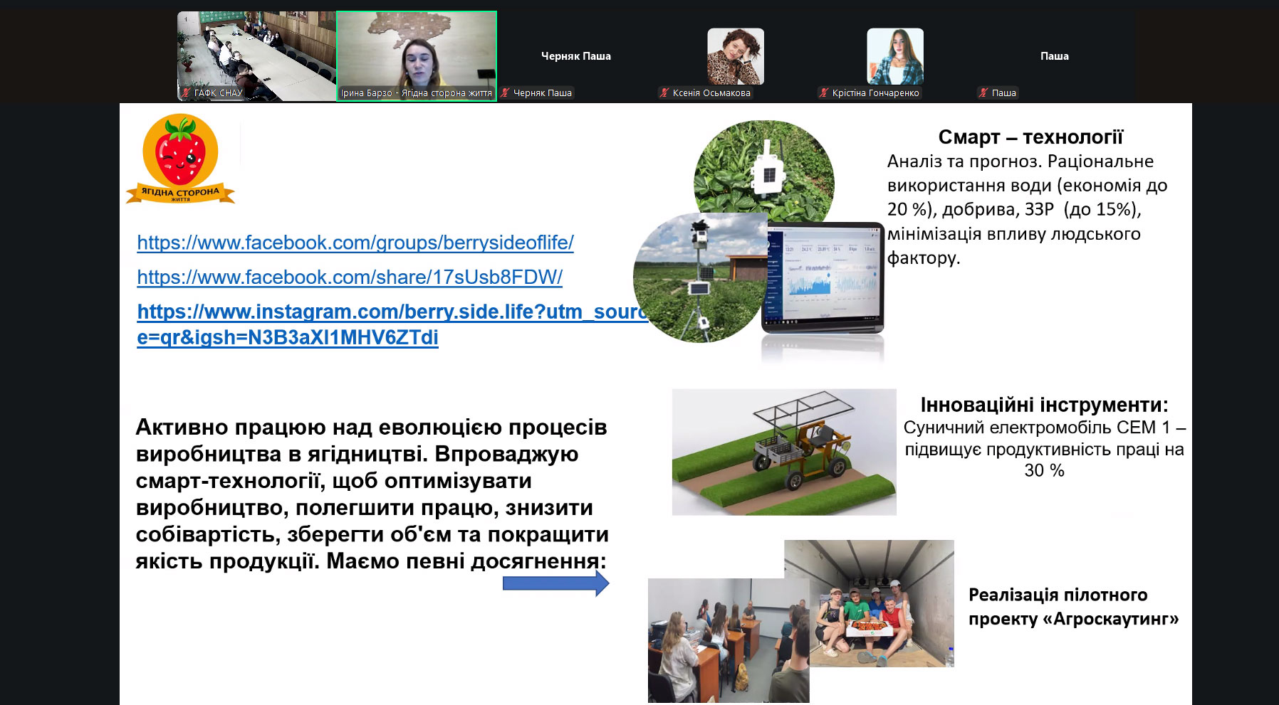 Серед іншого здобувачі освіти дізналися про запроваджені ПП «Ягідна сторона життя» смарт-технології та інноваційні інструменти, які дозволили більш раціонально використовувати воду (економія 20%), добрива й ЗЗР (економія 30%). Зокрема, лекторка продемонструвала відео роботи суничного електромобіля, який підвищив ефективність праці на 30%.